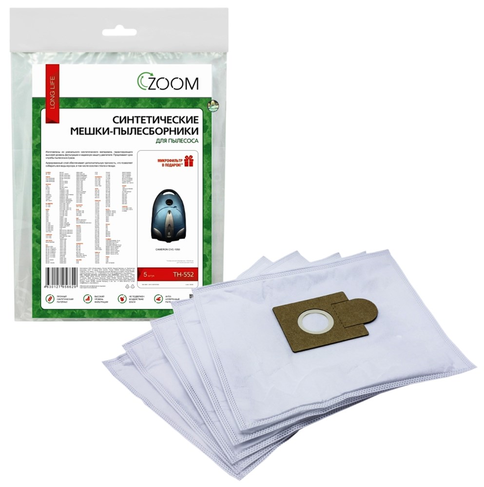 интетические пылесборники ZOOM TH-552 - незаменимый аксессуар для вашего пылесоса. Универсальные и прочные, они эффективно собирают все мелкие и крупные частицы пыли, а также волосы и шерсть домашних животных.